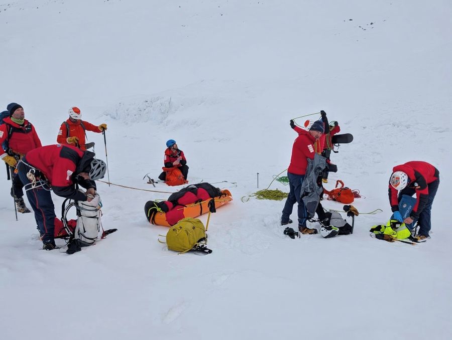 W takich warunkach – na stromym, zaśnieżonym zboczu – jedyną drogą ewakuacji był transport w specjalnych noszach typu SKED z użyciem zaawansowanych technik linowych. Metr po metrze, w pocie czoła, opuszczali nieprzytomnego mężczyznę w dół.