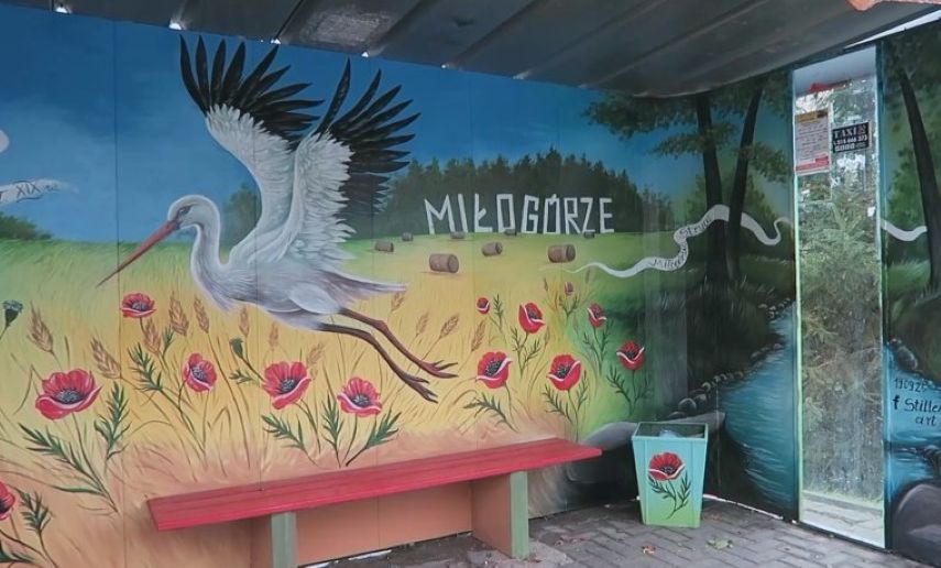 Każdy przystanek to unikatowa opowieść. Zanim artystka zabierze się do pracy, konsultuje projekt z mieszkańcami. W Miłogórzu, gdzie na prawie każdym dachu znajduje się bocianie gniazdo, na wiacie pojawiły się bociany i charakterystyczna dla wsi kapliczka.